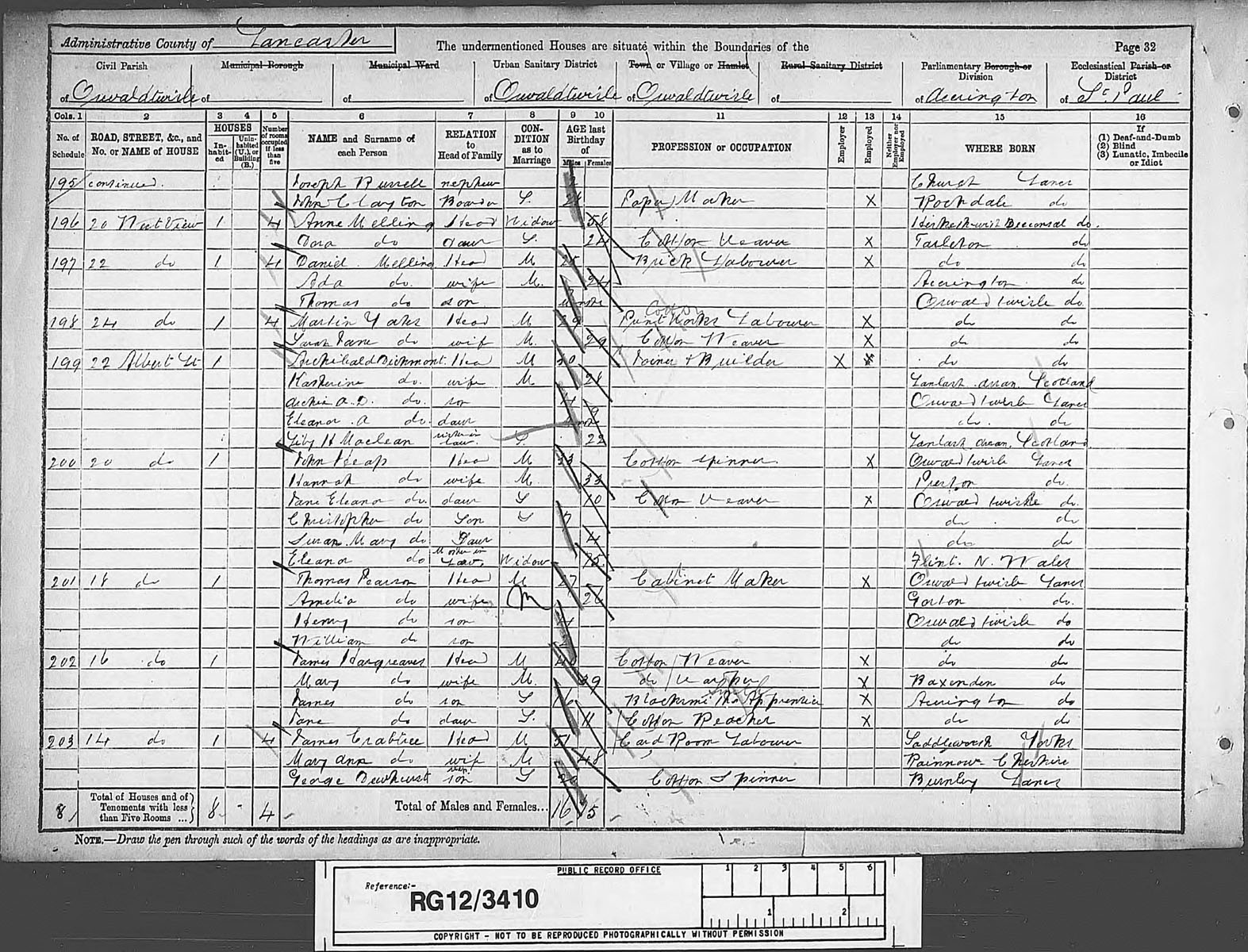 George and Sarah Ellen had three daughters by the time of the 1901 Census**. The eldest was Lydia, born in 1896, then Mary Alice (who was always known as Cissie) in 1899, and then Evelyn, my grandmother, who was born in 1900. My Aunt Bell told me they also had three sons, who must have been born after 1901, James (Jim), George, and Robert. The family were living at 24 Cog Lane, Burnley at this time. Interestingly, this is the street in which my parents, Jack and Joan Williams lived when they were first married in 1946. By 1901, George Senior, who had been a Cotton Weaver at the time of his marriage, was now listed as a Cotton Mule Spinner. When I first read this I thought it must have been a misprint and should have been Cotton Mill Spinner, but then I found there was a machine called a Cotton Mule, invented by Samuel Crompton in 1775. There is an interesting website that describes the various processes involved in the cotton industry at the Historic UK site. . Previous Generation: George's parents were EDWARD & MARY ANN (nee DRIVER) DEWHURST Sarah Ellen's parents were THOMAS BIRD & RUTH McDADE (nee Hargreaves)..