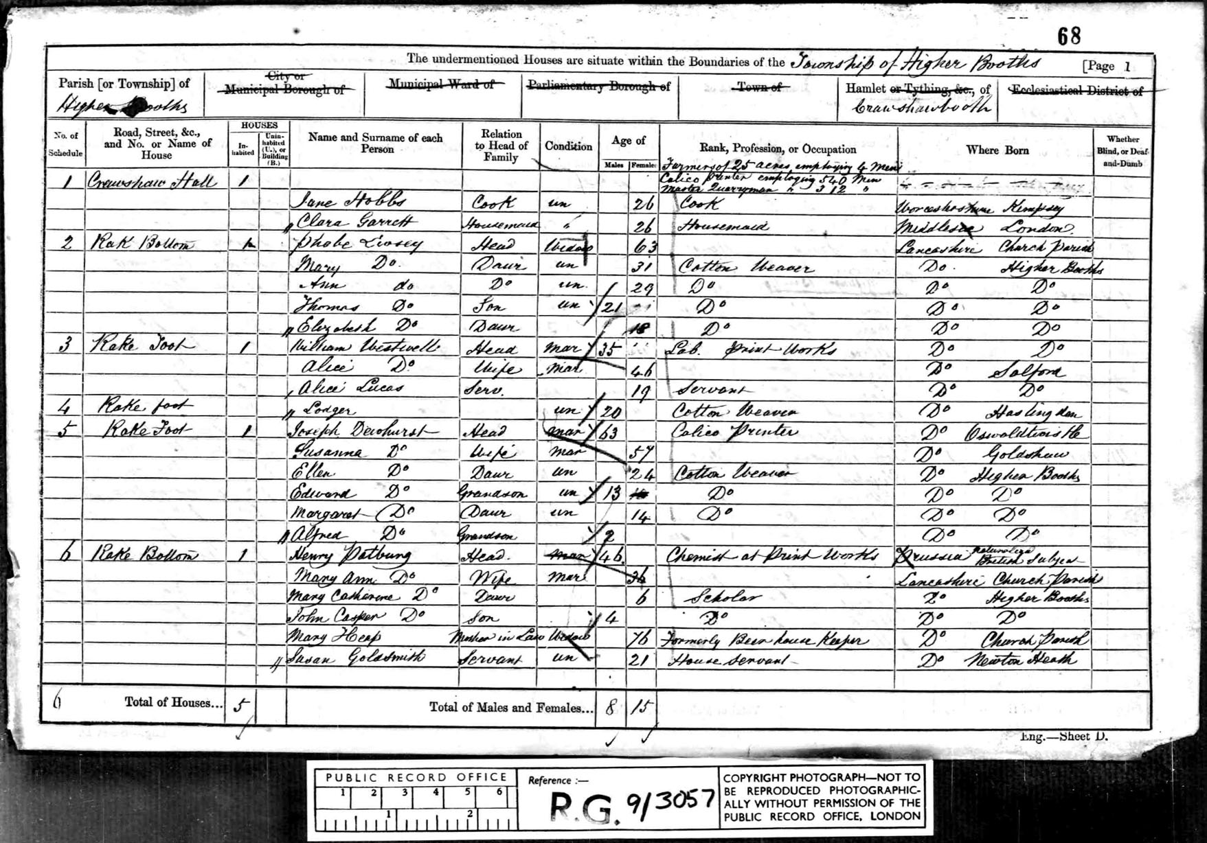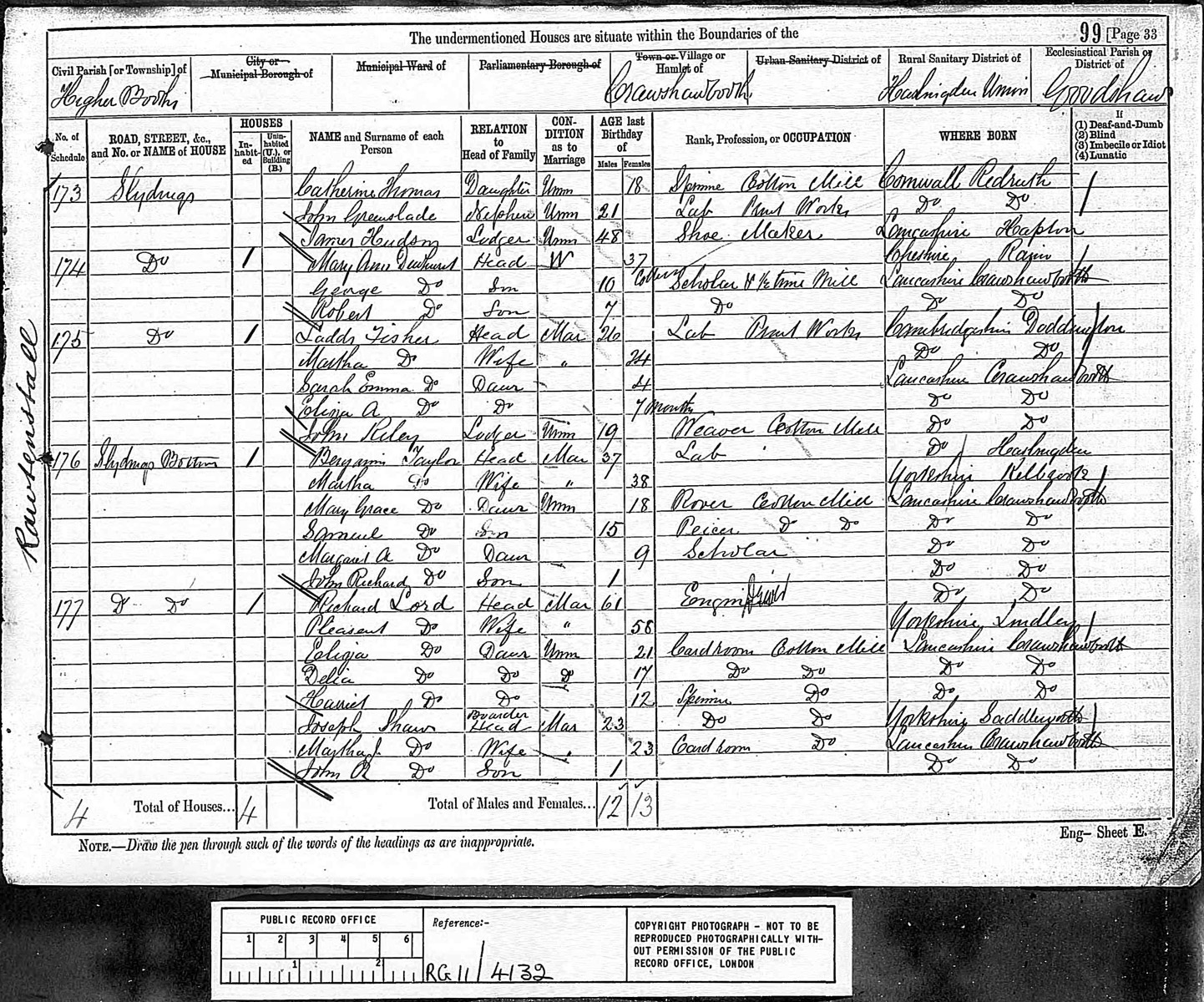 Sadly, Edward died November 27th 1880 when his sons George and Robert were 9 and 6 respectively. His death certificate recorded that he died from Phthisis (pronounced Ty'sis), which was usually T.B. The 1881 Census** would have been taken about four months later, when Mary Ann was living at Slydings, Higher Booths, which was where her in-laws, Robert and Mary Dewhurst and their children were living. They had left to live in Leeds for several years but had returned to Higher Booths some time between 1871 and 1881. Mary Ann is listed as a widow, but she has no occupation at this time. so probably her in-laws were helping out financially. Ten years later, in the 1891 Census**, Mary Ann had remarried and was living at 14 Albert Street in Oswaldtwistle, Lancashire. Her husband was James Crabtree, a 51-year-old card room labourer - this was presumably referring to carding, which is a process in the manufacture of cotton. George and Robert were both living at home. George was aged 20 and a cotton spinner. George married Sarah Ellen Bird on June 18th 1892, but Robert stayed at home until at least 1901, as he appears in the 1901 Census, aged 27 and still living with his mother, Mary Ann and stepfather, James Crabtree. His occupation was listed as a labourer in a chemical works. James Crabtree was 61 at this time and his occupation was a Card room bobbin carrier! Mary Ann's parents were Samuel and Mary Driver of Rainow, Cheshire. Their web page is at the Driver_Wadsworth page. For more information on Edward Dewhurst's parents, please go to the Dewhurst_Shannon page.