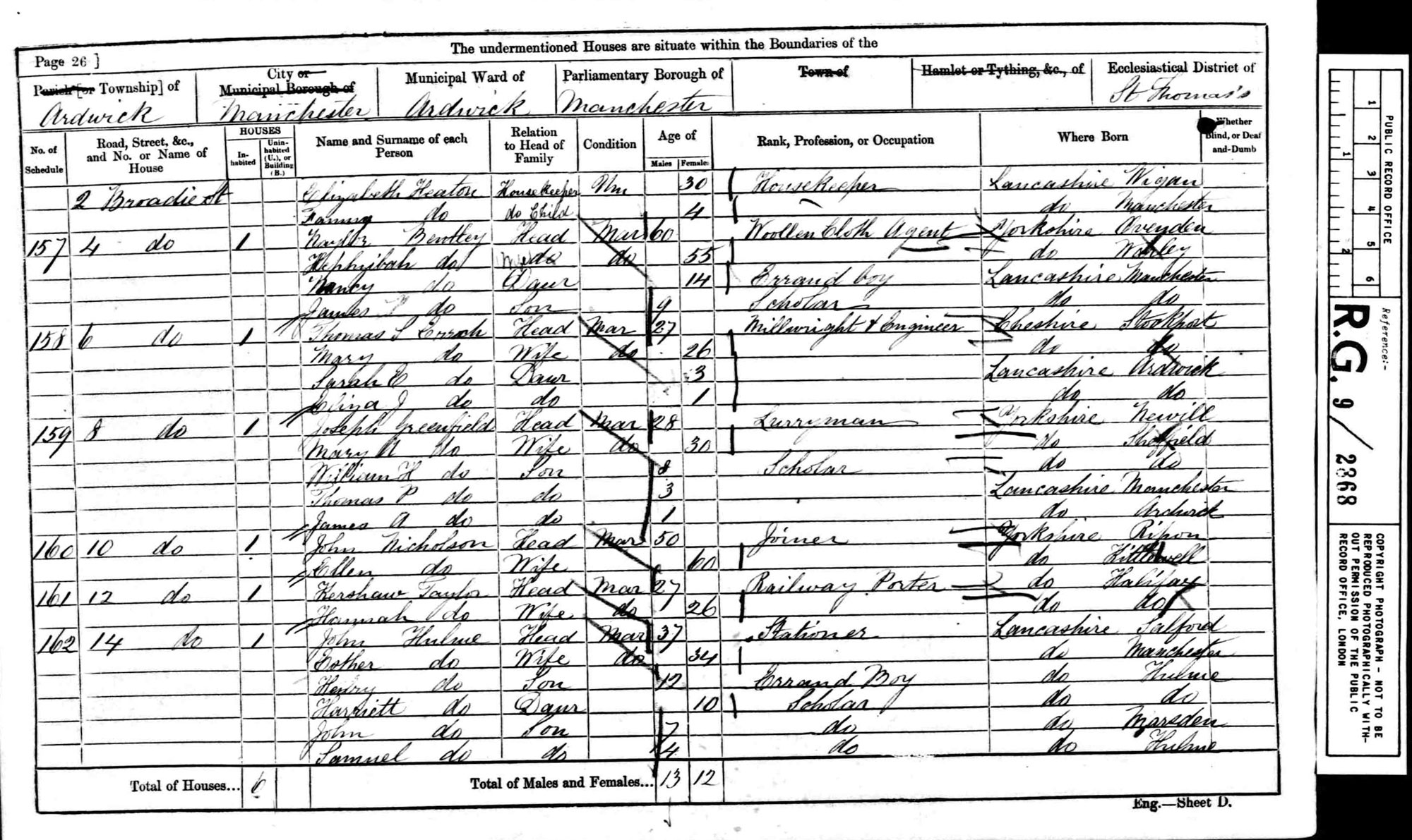 At the time of the 1901 Census, her oldest brother, Ernest was a tram conductor, and John was a lurryman for a Carriers company. A lurryman was the driver of a lurry, which was obviously where the more modern English term, lorry comes from (for North American readers - a truck). Of course, both these occupations involved horse-drawn vehicles! There is an excellent list of old occupations at: Eveline's older sister, Ada was an underclothing machinist when she would have been aged 15 or 16. On this Census, a Joseph Hulme, aged 26, lived right next door with his wife and son, which tempted me to think he might have been the eldest child of John and Ada, but he would have been born two years before they married, and he wasn't living with them at the time of the 1881 Census. It's possible he was either John's younger brother or a nephew, but it may just be a coincidence that they have the same name. Previous Generation: Eveline's mother, Ada, had been born Ada Vernon, December 22nd 1852. More information on Ada and the Vernon branch can be found on the VERNON-RILEY PAGE. John Hulme's parents were John and Esther Hulme (nee Willett). Please go next to the HULME-WILLETT PAGE.