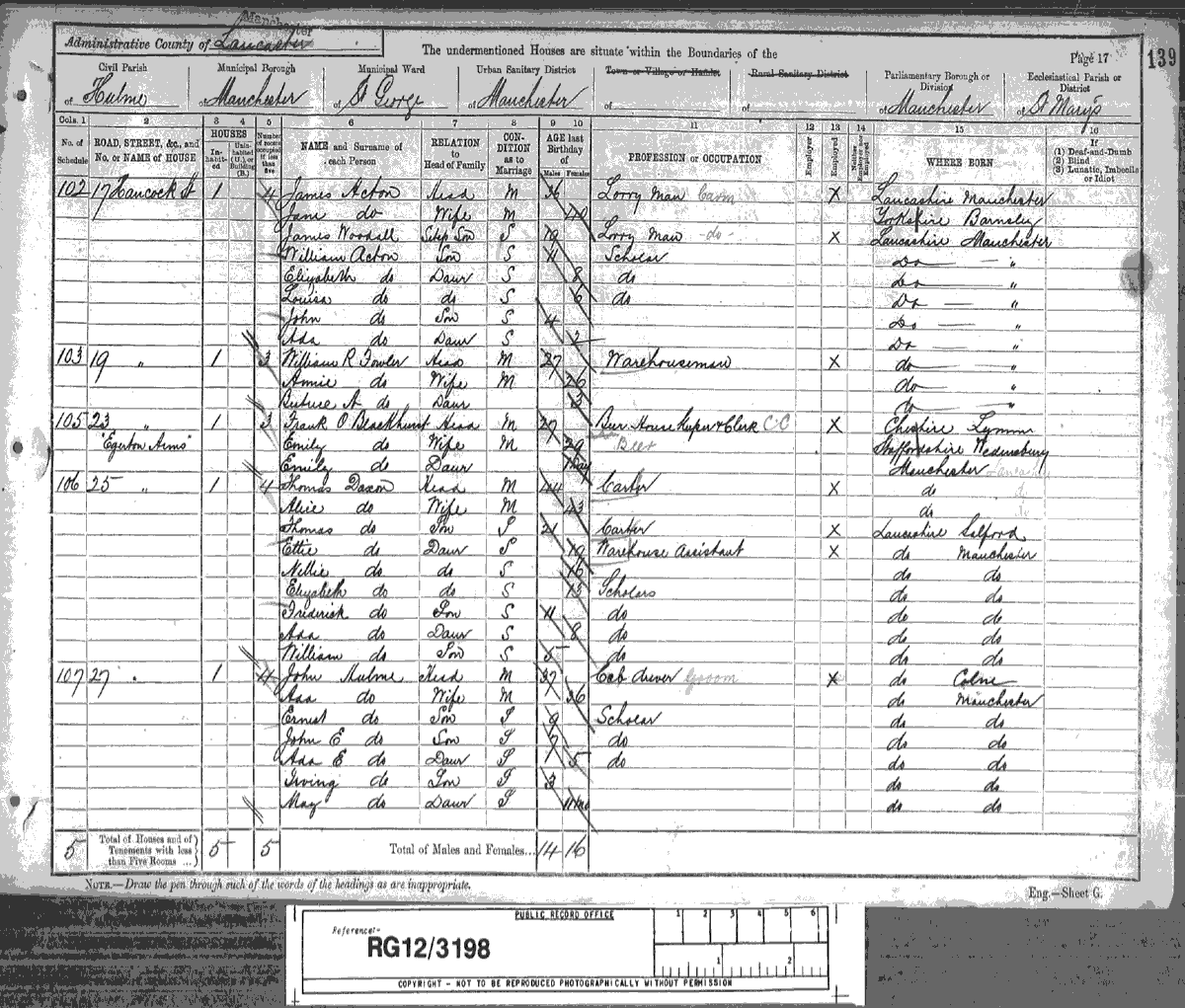My paternal grandmother, Eveline Hulme, was born in Hulme, a district of Manchester, Lancashire, May 31st 1896. Her parents were John and Ada Hulme (nee Vernon). The picture on the right is of Eveline and her sister Bertha. I would guess the year to be around the outbreak of the First World War when Eveline would have been about eighteen and Bertha nineteen. Eveline is on the right of the photo. Sadly, Eveline contracted TB and died at the age of 35, leaving five young children, one of whom was my then nine-year-old father. My Aunt Joyce told me her mother-in-law had described Eveline as a remarkable woman, who brought up her children well under very difficult circumstances. My father has fond memories of his Aunt Bertha, who gave him a home after a quarrel with his father. Please click here for the HULME FAMILY TREE. Eveline's father, John Hulme (b. Jan 5, 1853, Colne, Lancs), was a cab driver as recorded in the 1881 UK Census. This, of course, would have been a horse drawn hansom or hackney cab. In the 1901 Census, his occupation was listed as a Coachman (not domestic), which meant he was not in domestic service, so he must have worked for a company. I found it odd that John Hulme should be born at Primet Bridge in Colne, which is not far from Burnley, when his parents, grandparents and siblings were all born in Manchester. On John's birth certificate his father's occupation is listed as a mechanic. In the 1861 Census, John was aged seven and living with his parents, John and Esther Hulme at 14 Broadie Street, Ardwick, Manchester and John Hulme the elder was now a stationer, presumably living and working in his own shop. Although it was typical for daughters to go back to their mother's to have their babies, possibly Esther had been visiting friends or other relatives in Colne when she gave birth to John. John Hulme and Ada Vernon were married at the Holy Trinity Church, Manchester between July and September 1877. Four years later, at the time of the 1881 Census, they were living at 20 Victoria Street, Hulme, and had their first child, then 2-year-old Martha Annie Hulme, and later that year their eldest son Ernest was born. Sadly, only a year later Martha Annie died, aged three. John and Ada had nine children in all, but only six lived to adulthood, which was probably very typical of the times. Their children were; Martha Annie (1879-1882), Ernest (b. 1881), John E. (b. 1883), Ada E. (Cissie) (b. 1885), Irving (1888-1891), May (1890-1891), Mabel (b.1892), Bertha (b.1895), Eveline (1896-1931) At the time of the 1891 Census the family were living at 27 Hancock Street, Hulme. Mabel, Bertha and Eveline were not yet born, and Irving and May were the two youngest. These two children did not appear on the next Census in 1901, so I checked the Deaths and found that both of them died right after the 1891 Census was taken, as May was 11 months old on the Census and less than one-year-old on her death certificate. It is likely that they died of an illness such as smallpox or diphtheria. My