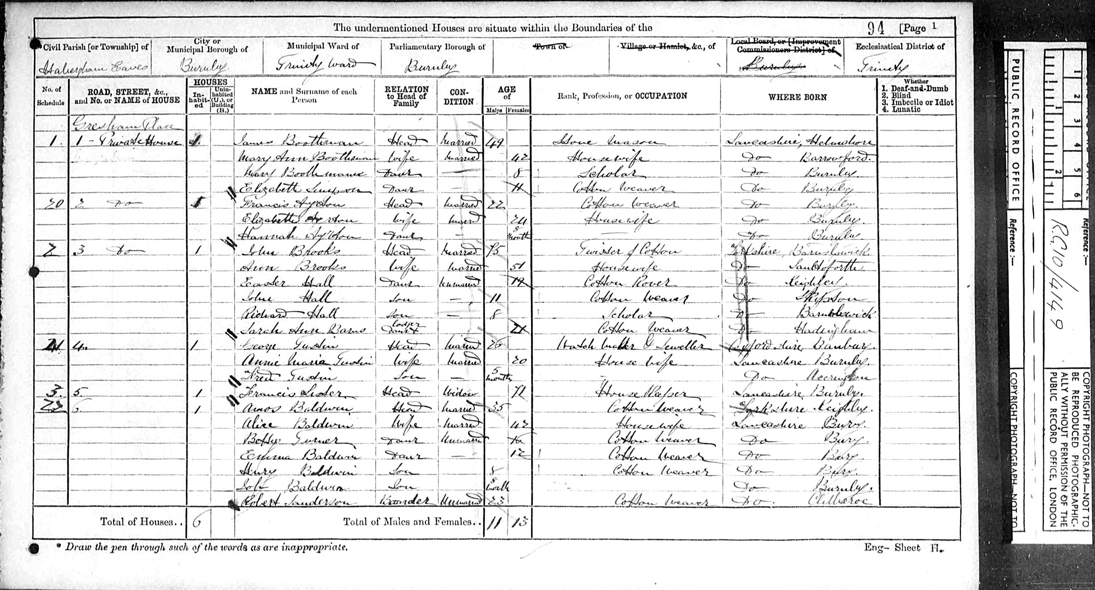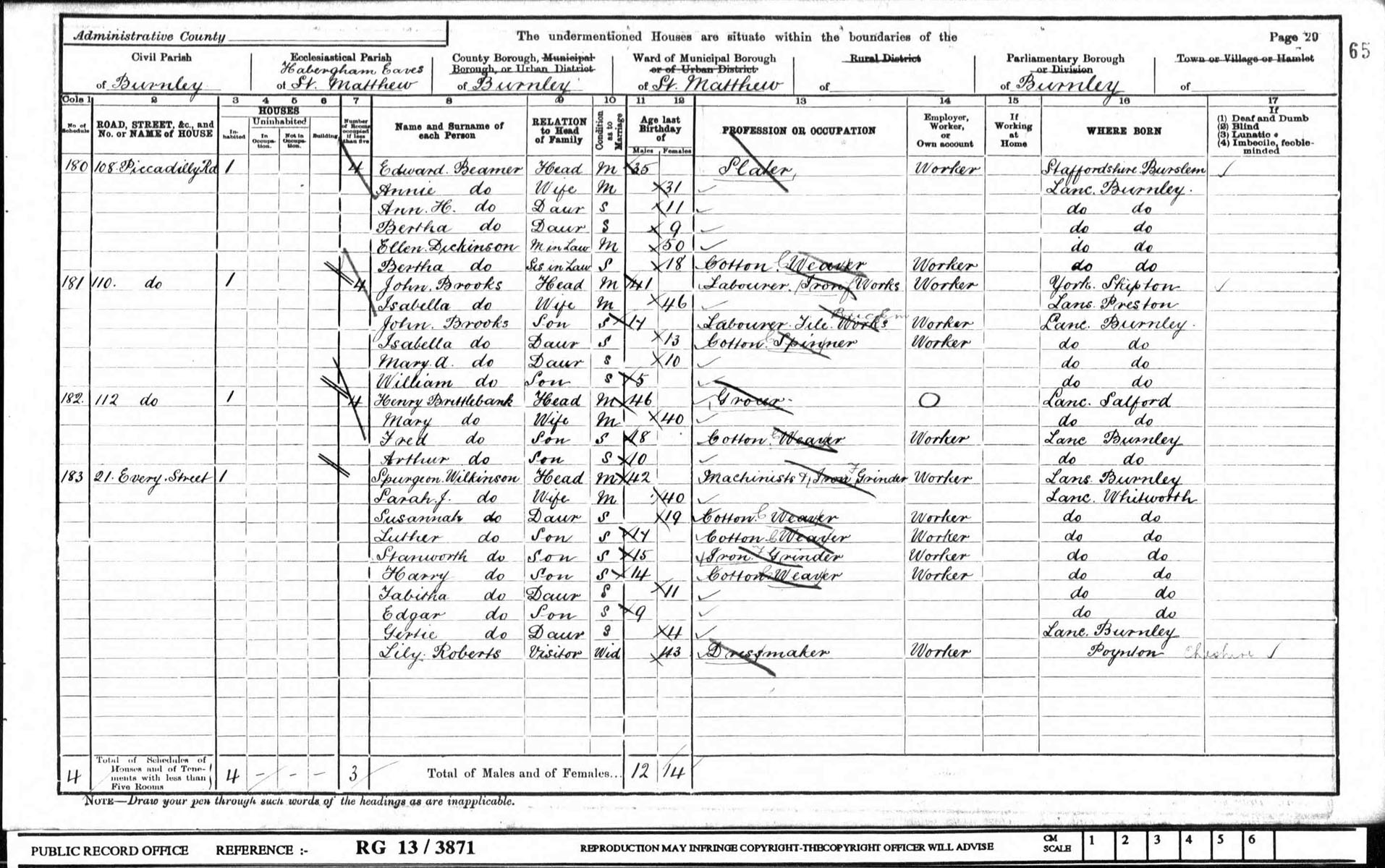 I found the Brooks line especially difficult to research, despite the fact that I found my Great-Grandfather, John Brooks in the 1881** and the 1901** UK Censi, so I knew he had been born in Skipton, Yorkshire in 1860. I also knew from his marriage certificate to my Great-Grandmother, Isabella Cartmell, that his father was also called John Brooks, who was recorded as being a Twister (this is an occupation in the cotton industry - see Occupations). I spent months of fruitless searching for any mention of John Brooks Senior and Junior prior to 1881. I attributed this to the fact that John Brooks was a common name, but I thought that I should have been able to find my Great-grandfather in the Free BMD (this is an amazing service that is a searchable database of Births, Marriages, and Deaths in the UK going back to 1837, the year civil registration started), but I had no luck. Up to this point I felt I had exhausted all the free resources available on the internet and I joined Ancestry.co.uk, a paid service that, at that time, offered access to the 1871, 1881, 1891, and 1901 Censi, as well as the same Births, Marriages, and Death information as Free BMD. I started looking for John Brooks in the 1871 Census, when he would have been aged 11. I found a John Brooks and his wife Ann, who had 2 sons and 2 daughters listed. Their names were Easter, John, and Richard Hall, and Sarah Ann Barns (listed as both daughter and a lodger). John Brooks Senior was listed as being a Twister. John Hall was recorded as being born in Skipton in 1860. The family was living in the Habergham Eaves district of Burnley. John Brooks 1871 Census - Image** There were so many correct threads here I decided this needed further investigation and went back to the 1881 Census**. At this point, John Brooks Junior was aged 21 and was living as a lodger with William and Sarah Booth at 29 Dale Street, Habergham Eaves. He was recorded as being John Brooks at this point, although he had been John Hall in the previous census 10 years earlier. Later that year, on November 27, he married Isabella Cartmell in the Holy Trinity Church, Habergham Eaves. |