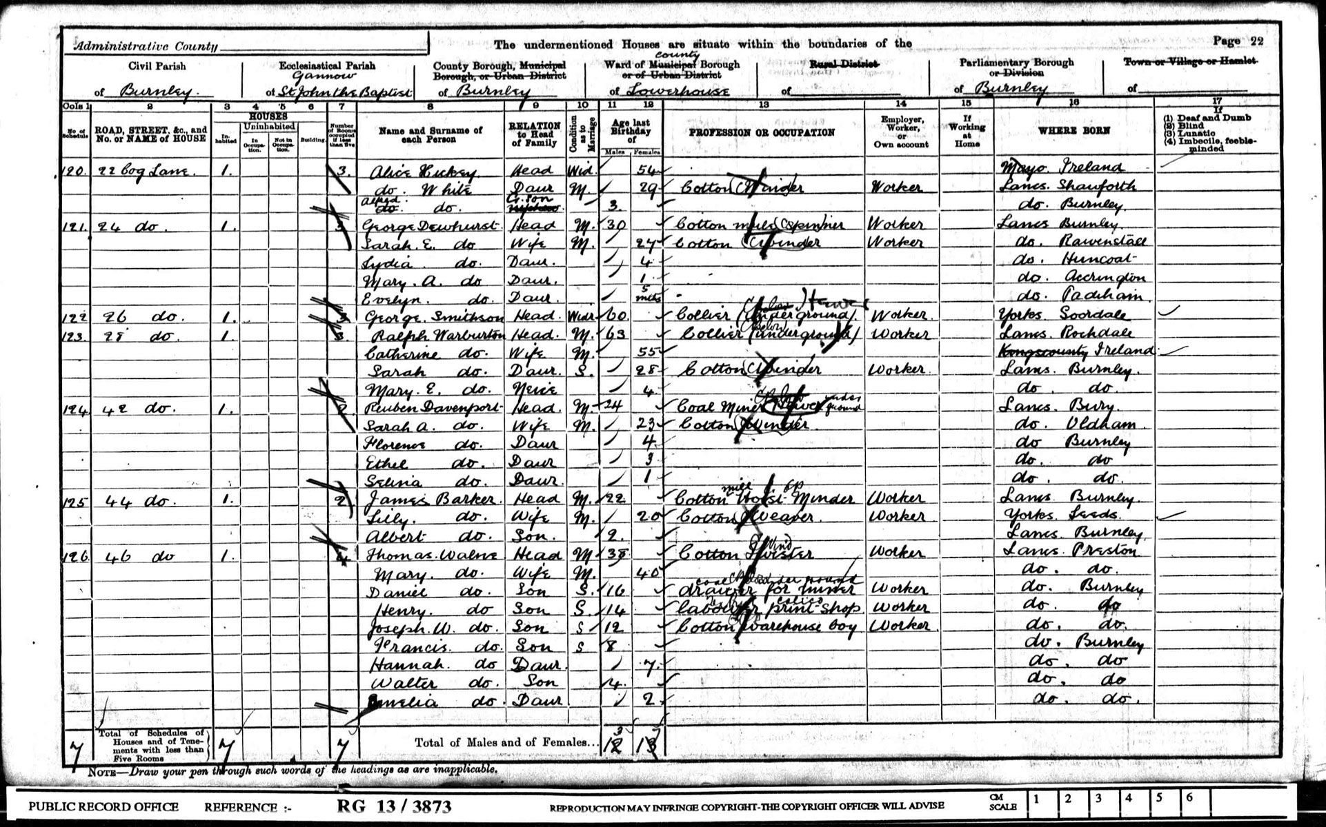 George and Sarah Ellen had three daughters by the time of the 1901 Census**. The eldest was Lydia, born in 1896, then Mary Alice (who was always known as Cissie) in 1899, and then Evelyn, my grandmother, who was born in 1900. My Aunt Bell told me they also had three sons, who must have been born after 1901, James (Jim), George, and Robert. The family were living at 24 Cog Lane, Burnley at this time. Interestingly, this is the street in which my parents, Jack and Joan Williams lived when they were first married in 1946. By 1901, George Senior, who had been a Cotton Weaver at the time of his marriage, was now listed as a Cotton Mule Spinner. When I first read this I thought it must have been a misprint and should have been Cotton Mill Spinner, but then I found there was a machine called a Cotton Mule, invented by Samuel Crompton in 1775. There is an interesting website that describes the various processes involved in the cotton industry at the Historic UK site. . Previous Generation: George's parents were EDWARD & MARY ANN (nee DRIVER) DEWHURST Sarah Ellen's parents were THOMAS BIRD & RUTH McDADE (nee Hargreaves)..