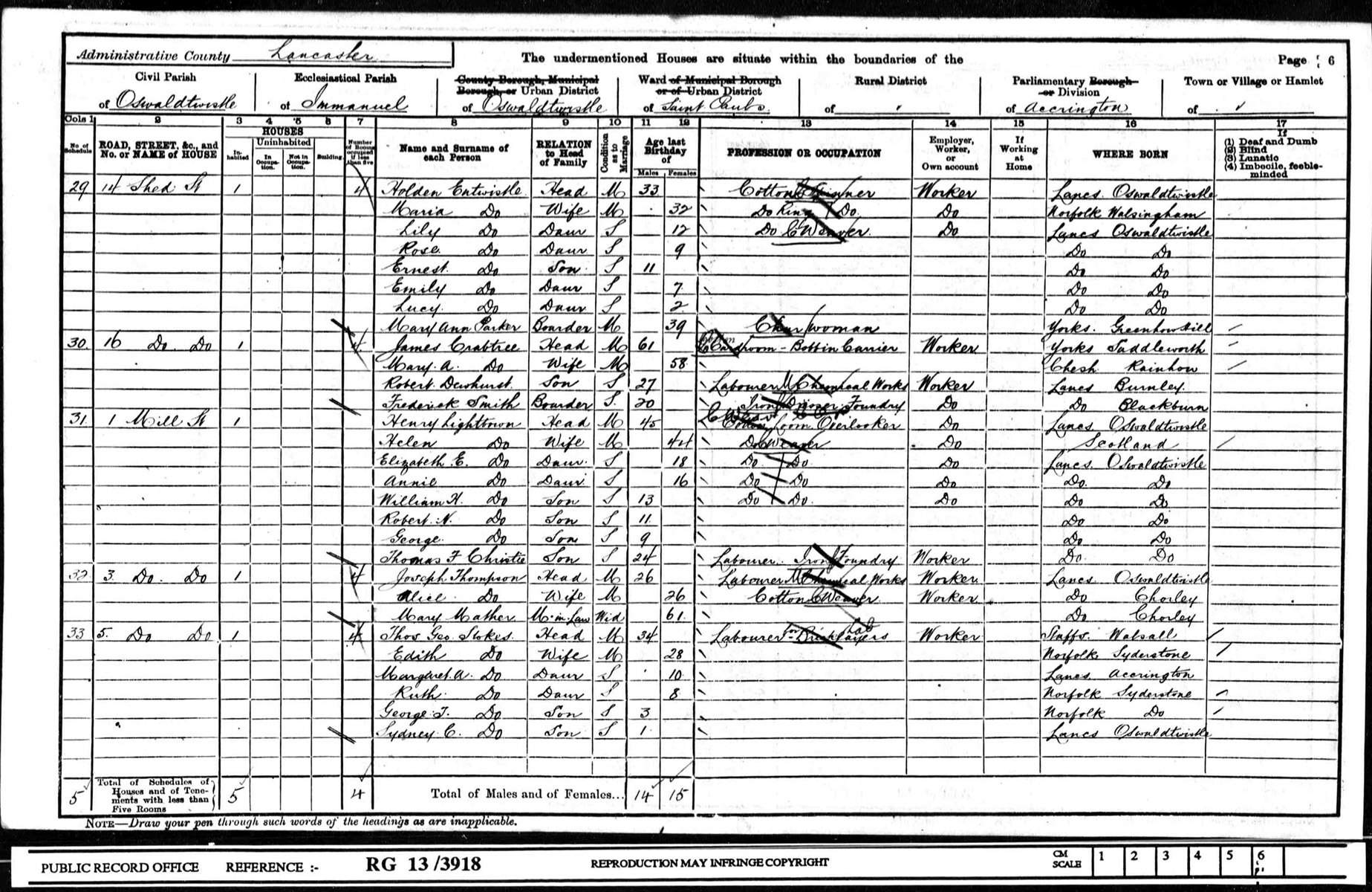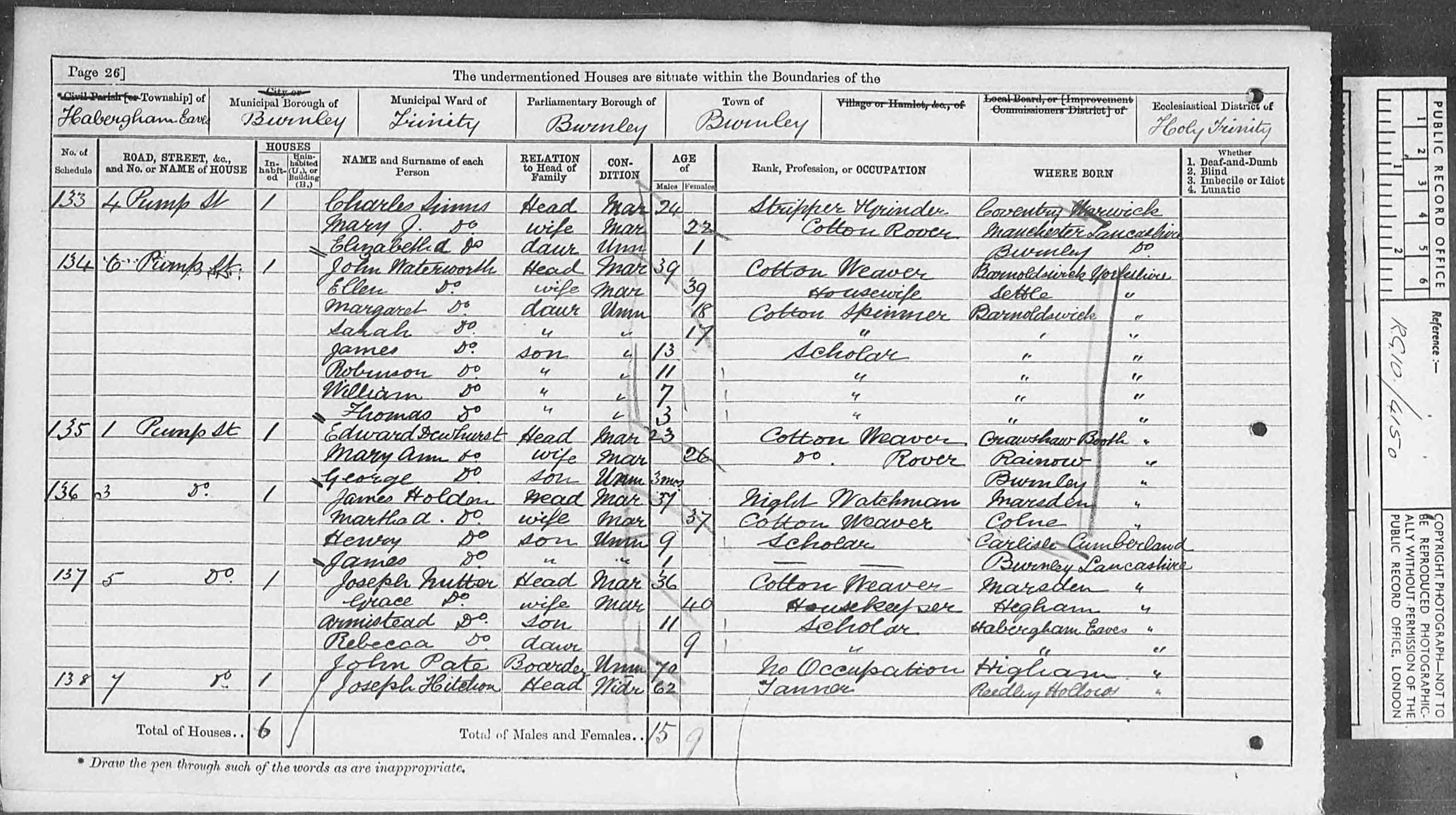 George Dewhurst's parents were Edward Dewhurst and Mary Ann Driver. This was another case of a man marrying an older woman, as Mary Ann was six years older than Edward. Edward was born in Crawshawbooth, Lancashire, March 29th 1848 to Robert Dewhurst, a block printer, and Elizabeth Shannon. Crawshawbooth is in the Rossendale Valley area and a modern picture of the town can be seen at: Crawshawbooth, Rossendale Valley, Lancashire I haven't been able to find a record of Robert and Elizabeth's marriage, but Elizabeth is recorded as being Edward's mother on his birth certificate. Edward was their only child and Elizabeth died in 1851 when Edward was only four. In 1860, Robert married again, to Mary Pointon, who had been born in Bradley Green, Biddulph, Cheshire (although Biddulph is sometimes reported as being in Staffordshire - I think the county lines may have changed during the 19th Century, which probably accounts for this). There is more information on Robert Dewhurst and his family on the Dewhurst-Shannon page. In the 1861 Census**, the 13-year-old Edward was living with his grandparents, Joseph and Susannah Dewhurst at Rake Foot, Higher Booths, and working as a cotton weaver. His father's new wife gave birth to a daughter, Martha, born in January 1861 while they were still living in Crawshawbooth, but in the next couple of months, Robert and Mary took Martha and went to live in Leeds, leaving Edward with his grandparents. Robert and Mary are included in the Leeds Census in 1861** and baby Martha is reported as being just three months old. Joseph and Susannah also had another grandchild living with them in 1861 - two-year-old Alfred Dewhurst, and I'm not sure whose son he was. He was born in 1859 and Robert and Mary had married in 1860, so I don't think he was their son, especially as Robert and Mary didn't take him with them when they moved to Leeds. It is more likely that he was the illegitimate son of Ellen Dewhurst, or even of Robert Dewhurst before he met Mary Pointon., in which case he would have been Edward's half-brother. So Edward didn't have an easy childhood, but it was probably not very different from a lot of children at that time. He must have met his wife-to-be, Mary Ann Driver sometime between 1863 and 1868, which is the year they married. Mary Ann's life until that time had been even harder, losing her mother and then her father. She probably moved to Burnley because she had to find work. The details of her early life are on the Driver-Wadsworth page. Edward and Mary Ann married in the Holy Trinity Church, Habergham Eaves, Burnley, Lancashire, October 31st 1868. Their elder son, George (my great grandfather) was born December 14th 1870, and their second son Robert in 1873. In the 1871 Census** Edward, Mary Ann and 3-month-old George were living at 1 Pump Street, Habergham Eaves, Burnley, and Edward was working as a Cotton Weaver and Mary Ann as a Cotton Rover. When I had first found Mary Ann her occupation had been reported as a Rover. I knew nothing about the cotton industry at that time and I had no idea what a rover might be - I wondered if she were some sort of Gypsy! I found that roving is one of the processes in preparing cotton to be spun, and there is more information on this at: Cotton Processing and Mill Occupations