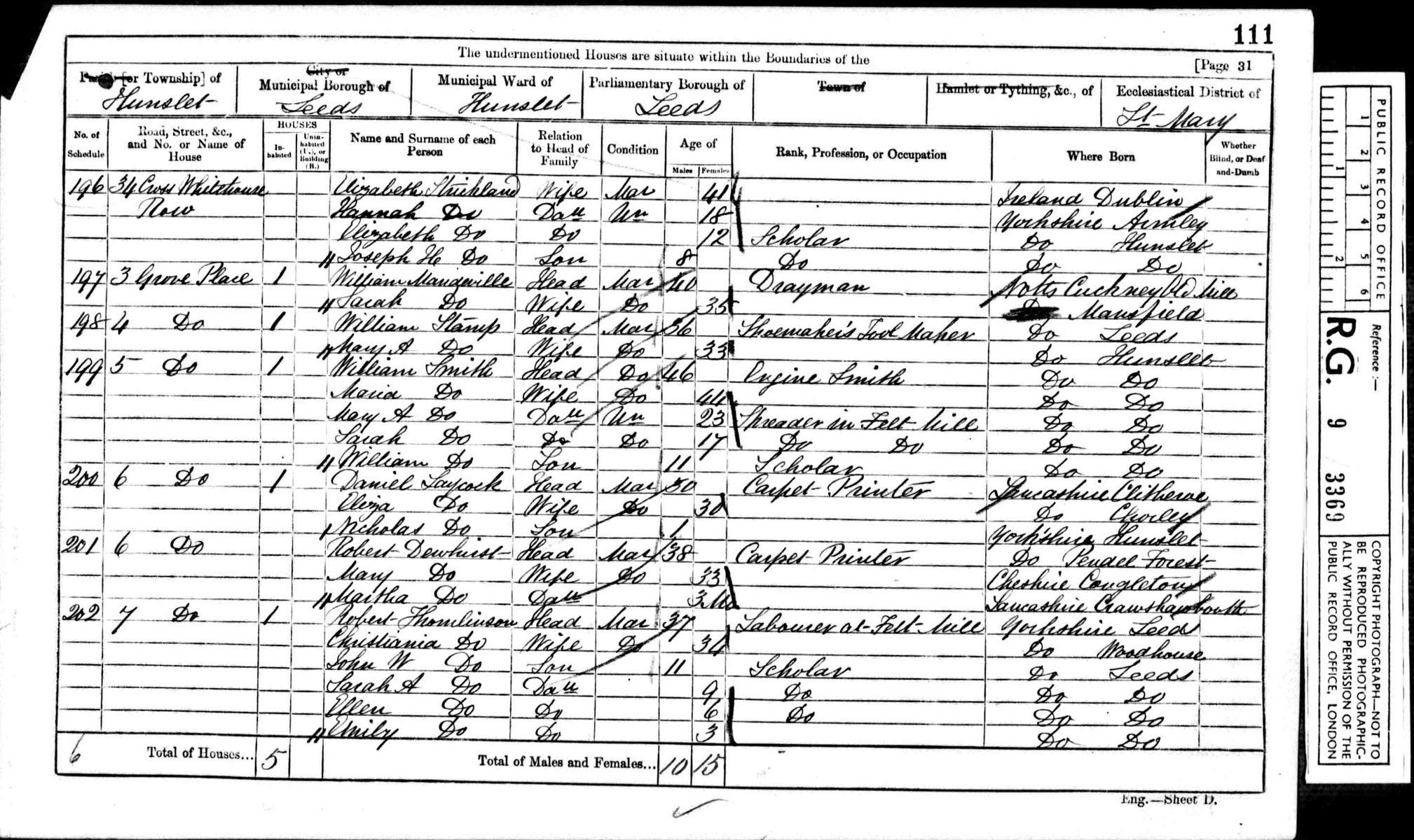 Sadly, Edward died November 27th 1880 when his sons George and Robert were 9 and 6 respectively. His death certificate recorded that he died from Phthisis (pronounced Ty'sis), which was usually T.B. The 1881 Census** would have been taken about four months later, when Mary Ann was living at Slydings, Higher Booths, which was where her in-laws, Robert and Mary Dewhurst and their children were living. They had left to live in Leeds for several years but had returned to Higher Booths some time between 1871 and 1881. Mary Ann is listed as a widow, but she has no occupation at this time. so probably her in-laws were helping out financially. Ten years later, in the 1891 Census**, Mary Ann had remarried and was living at 14 Albert Street in Oswaldtwistle, Lancashire. Her husband was James Crabtree, a 51-year-old card room labourer - this was presumably referring to carding, which is a process in the manufacture of cotton. George and Robert were both living at home. George was aged 20 and a cotton spinner. George married Sarah Ellen Bird on June 18th 1892, but Robert stayed at home until at least 1901, as he appears in the 1901 Census, aged 27 and still living with his mother, Mary Ann and stepfather, James Crabtree. His occupation was listed as a labourer in a chemical works. James Crabtree was 61 at this time and his occupation was a Card room bobbin carrier! Mary Ann's parents were Samuel and Mary Driver of Rainow, Cheshire. Their web page is at the Driver_Wadsworth page. For more information on Edward Dewhurst's parents, please go to the Dewhurst_Shannon page.