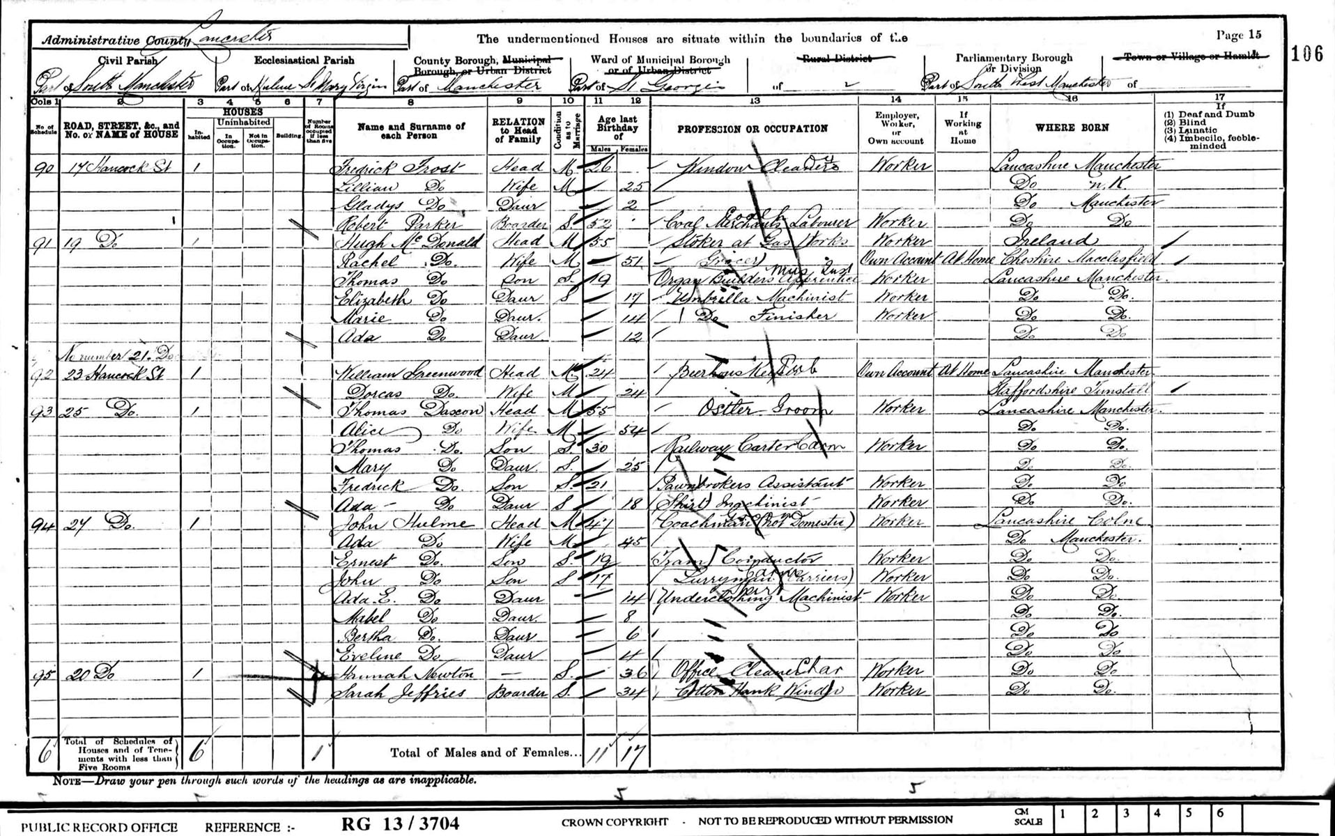 My paternal grandmother, Eveline Hulme, was born in Hulme, a district of Manchester, Lancashire, May 31st 1896. Her parents were John and Ada Hulme (nee Vernon). The picture on the right is of Eveline and her sister Bertha. I would guess the year to be around the outbreak of the First World War when Eveline would have been about eighteen and Bertha nineteen. Eveline is on the right of the photo. Sadly, Eveline contracted TB and died at the age of 35, leaving five young children, one of whom was my then nine-year-old father. My Aunt Joyce told me her mother-in-law had described Eveline as a remarkable woman, who brought up her children well under very difficult circumstances. My father has fond memories of his Aunt Bertha, who gave him a home after a quarrel with his father. Please click here for the HULME FAMILY TREE. Eveline's father, John Hulme (b. Jan 5, 1853, Colne, Lancs), was a cab driver as recorded in the 1881 UK Census. This, of course, would have been a horse drawn hansom or hackney cab. In the 1901 Census, his occupation was listed as a Coachman (not domestic), which meant he was not in domestic service, so he must have worked for a company. I found it odd that John Hulme should be born at Primet Bridge in Colne, which is not far from Burnley, when his parents, grandparents and siblings were all born in Manchester. On John's birth certificate his father's occupation is listed as a mechanic. In the 1861 Census, John was aged seven and living with his parents, John and Esther Hulme at 14 Broadie Street, Ardwick, Manchester and John Hulme the elder was now a stationer, presumably living and working in his own shop. Although it was typical for daughters to go back to their mother's to have their babies, possibly Esther had been visiting friends or other relatives in Colne when she gave birth to John. John Hulme and Ada Vernon were married at the Holy Trinity Church, Manchester between July and September 1877. Four years later, at the time of the 1881 Census, they were living at 20 Victoria Street, Hulme, and had their first child, then 2-year-old Martha Annie Hulme, and later that year their eldest son Ernest was born. Sadly, only a year later Martha Annie died, aged three. John and Ada had nine children in all, but only six lived to adulthood, which was probably very typical of the times. Their children were; Martha Annie (1879-1882), Ernest (b. 1881), John E. (b. 1883), Ada E. (Cissie) (b. 1885), Irving (1888-1891), May (1890-1891), Mabel (b.1892), Bertha (b.1895), Eveline (1896-1931) At the time of the 1891 Census the family were living at 27 Hancock Street, Hulme. Mabel, Bertha and Eveline were not yet born, and Irving and May were the two youngest. These two children did not appear on the next Census in 1901, so I checked the Deaths and found that both of them died right after the 1891 Census was taken, as May was 11 months old on the Census and less than one-year-old on her death certificate. It is likely that they died of an illness such as smallpox or diphtheria. My