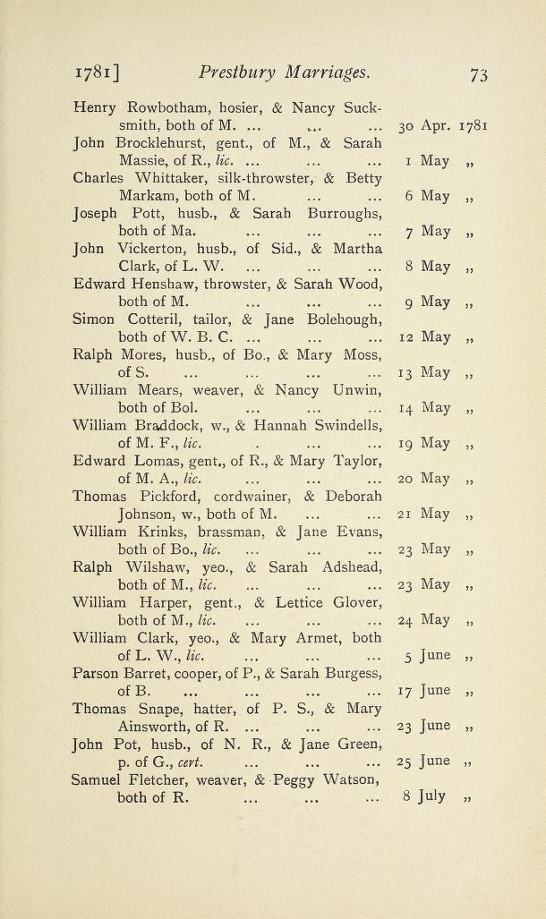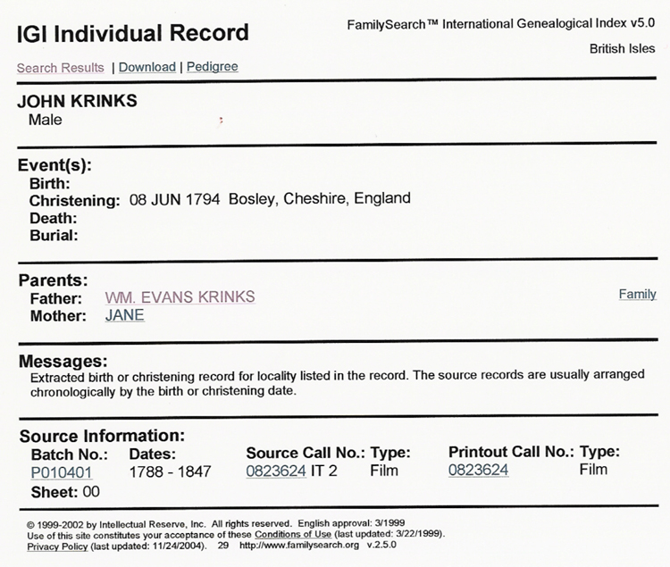 John Evans Krinks' parents were William Evans Krinks and Jane Evans. William Krinks was born about 1756 in Bosley, Cheshire, part of the Prestbury Parish. Jane Evans was born in 1760 in Bosley. There is a record of their marriage in the "Cheshire: - Registers of Marriages, 1771-1789; Corrigendum. Vol. 2 (Prestbury, Part 1) which lists a William Krinks, Brassman, & Jane Evans**, both of Bosley, married by licence 23rd May 1781, probably in the church above. Jane
