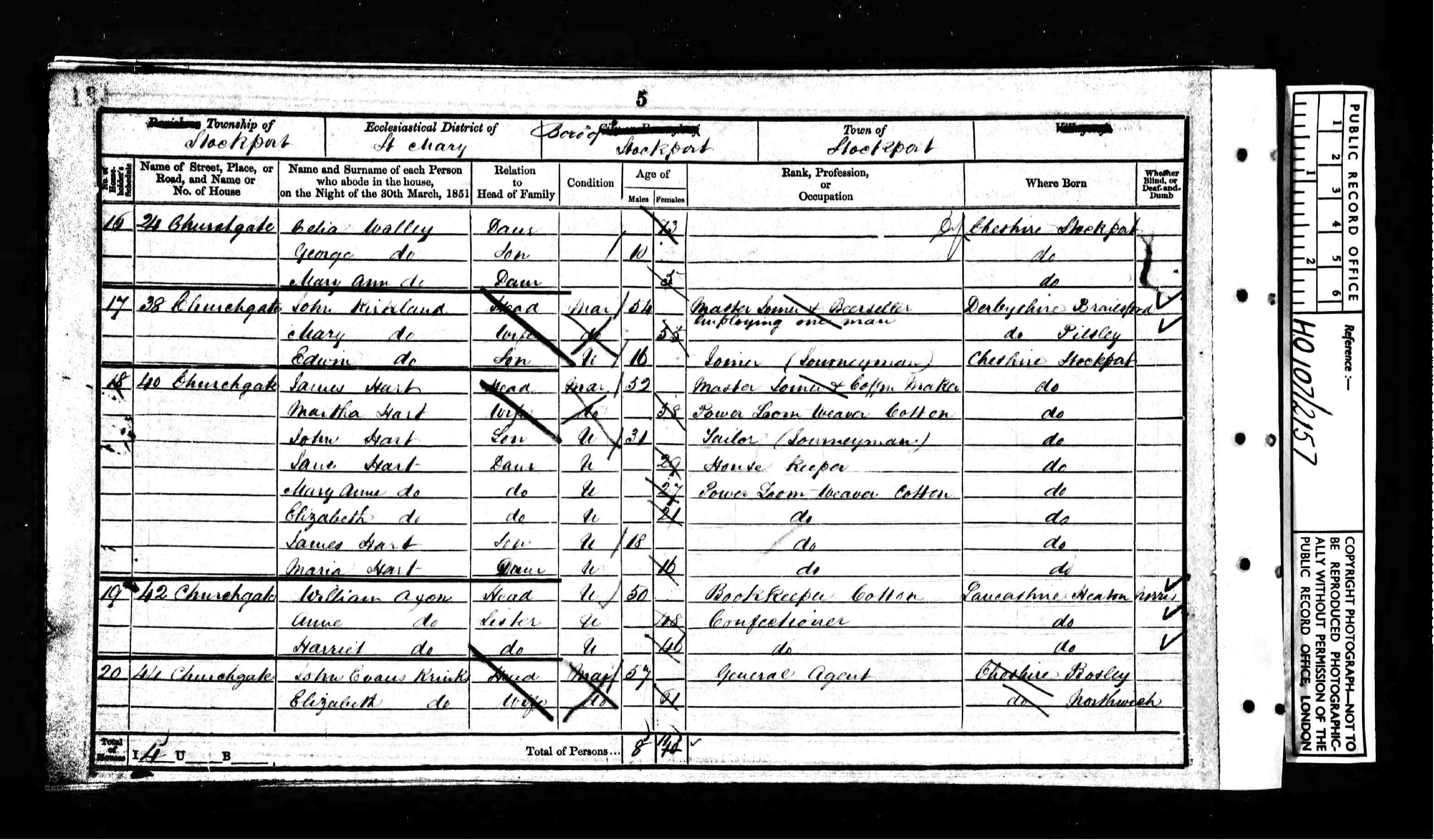 The Krinks and Evans families belong to the Williams line, Daniel Williams having married Emma Krinks (see Williams-Krinks). Emma Krinks was living at 44 Churchgate, Stockport before her marriage. Her parents were John Evans Krinks and Elizabeth Krinks. I haven't been able to find any details of their marriage, but they are listed in the 1851 Census, which would have been taken a couple of months after the marriage of their daughter. They are living at 44 Churchgate and there are no other children living at home at that time. John is recorded as being 57, which would have meant he was born in 1793. His wife Elizabeth is aged 61, so she would have been born around 1790. John's occupation was General Agent, which, in the 19th Century, seems to have been some sort of overseer, either of a business or estate. His birthplace was Bosley, Cheshire, and there is a record of John Krinks christening on June 8th 1784* on the FamilySearch website. Elizabeth came from Northwich, Cheshire. There is a historical map of Northwich in the Francis Frith collection at: Northwich, Cheshire. I can't find any mention of John or Elizabeth in any census beyond 1851, but John Krinks died September 24th 1873 at the age of 82. He died from bronchitis at the home of his daughter and son-in-law, Emma and Daniel Williams at 42 Lower Moss Lane in Hulme, Manchester. He may have just been staying there because he was ill, or he may have moved in permanently because his wife had died. His granddaughter Elizabeth was present at the death. She would have been aged 16 or 17 at the time.