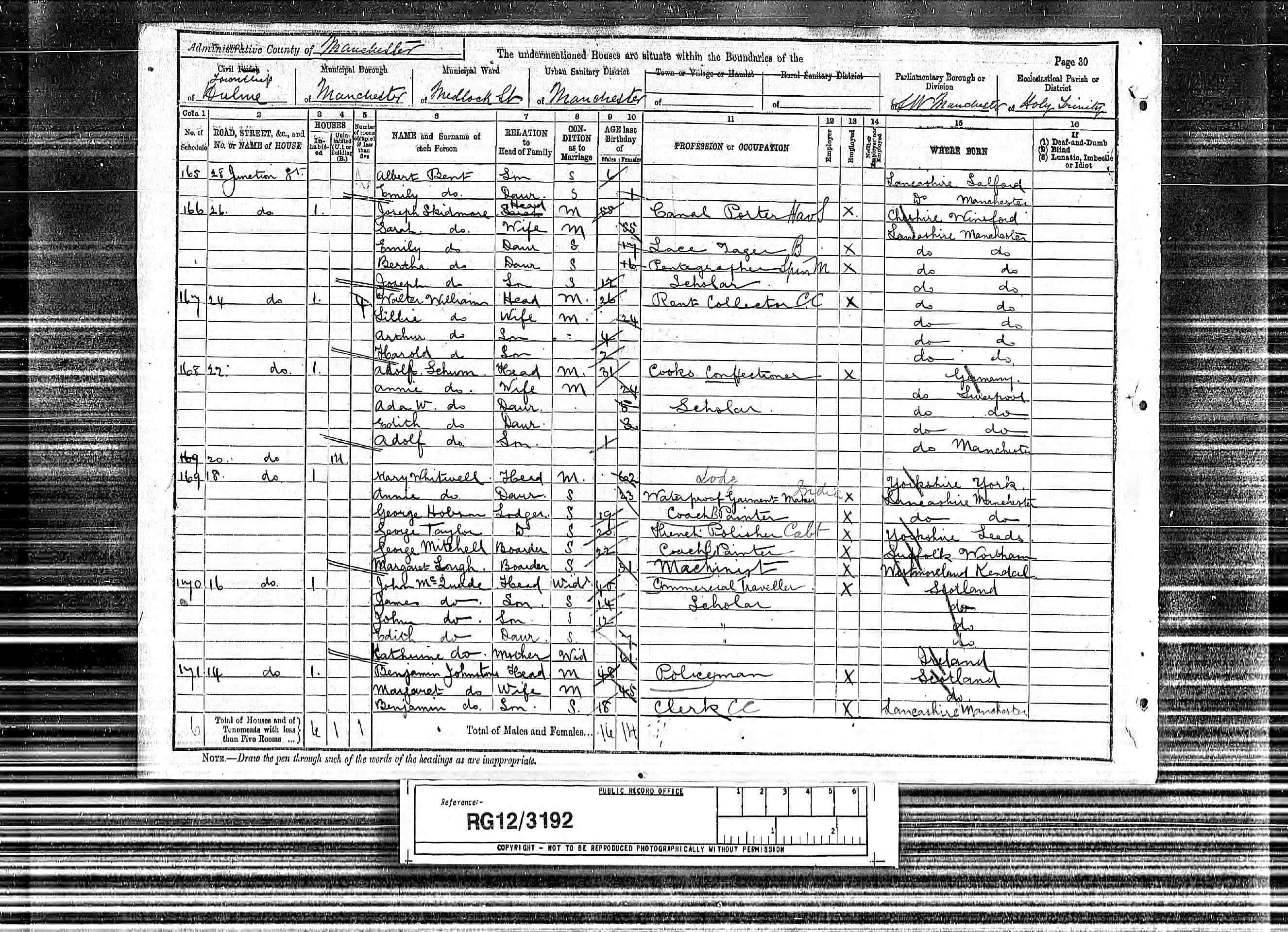 Lillie's parents were Joseph and Sarah Ann Skidmore (nee Waddell Ogden). Lillie's actual name was Elizabeth and information on the family can be found in the 1871 Census**, when Lillie was aged four. By the time of the 1881 Census*, (Lillie was recorded as being an apprentice book binder at age 14. For a long time I wasn't absolutely sure that Lillie was Elizabeth Skidmore, but from her marriage certificate I knew her father's name was Joseph, and the age of Elizabeth Skidmore matched that reported for Lillie. There wasn't another Joseph Skidmore living in Hulme at that time, so I was pretty certain Elizabeth and Lillie were one and the same, but there is always that nagging doubt that you may have hit on the wrong family. Fortunately, I noticed something I had missed on the 1891 Census, which was that the recently married Walter and Lillie and their two young sons, Arthur and Harold were living right next door to Lillie's parents at 24 and 26 Junction Street, Hulme. Walter